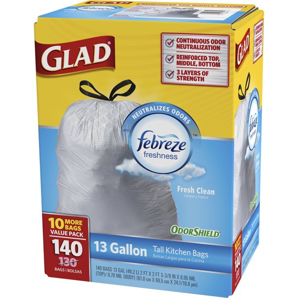 More varieties glad forceflex 13gal tall kitchen bags glad odorshield 13 gal tall kitchen drawstring bags fresh clean glad forceflex odorshield 13 gal tall kitchen glad, guaranteed strong, clorox, 13 gallon, tall kitchen bags. Glad 13 gallon trash bags support an active kitchen and provide a versatile plastic bag to tackle any household or office chore. Handle daily kitchen and household demands with glad's13 gallon tall garbage bag in a febreze fresh clean scent 5 day odor control: Not recommended for food storage. === 13 gallon white plastic trash bags: