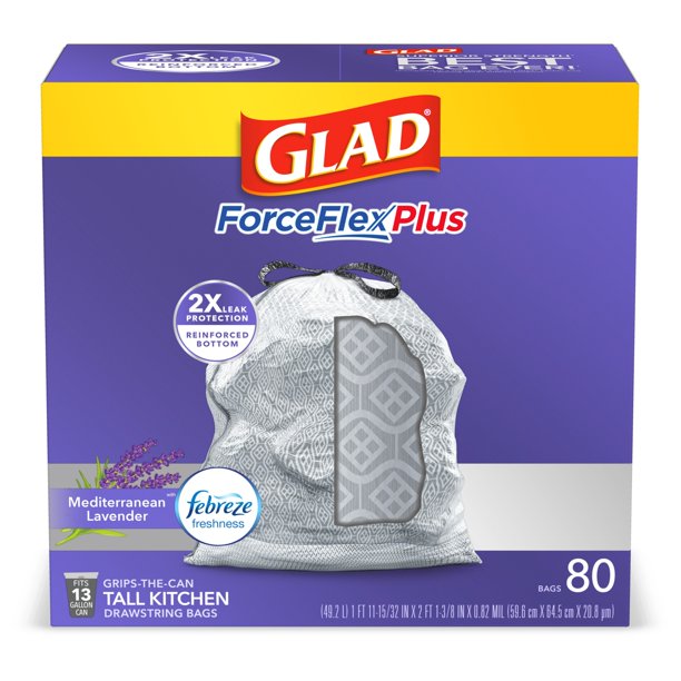 Add glad's 13 gallon kitchen trash bags to household cleaning supplies to tackle messes of all sizes; Ideal for use in schools, daycare centers, restaurants, hotels and other. 13 gallon plastic trash bags: Prevent rips and tears with glad's unique checkerboard design allowing bag to stretch for reinforced strength and leakguard for added leak. Glad tall kitchen drawstring bags are made strong and durable to help prevent trash disaster in the home. Glad tall kitchen drawstring trash bags with stretchable strength, traps, locks and neutralizes odors to keep your kitchen smelling fresh with a gain original scent; Toss the secure bag into the garbage. Glad offers leakguard, ripguard, forceflex and odorshield technology providing a trash bag that protects against any kitchen disasters. Not recommended for food storage. Glad tall kitchen drawstring trash bags with stretchable strength. Prevent rips and tears with glad's unique design allowing bag to stretch at top while reinforced bands through middle contain bulk. 13 gallon size for tall garbage bins. Love these drawstring trash bags.