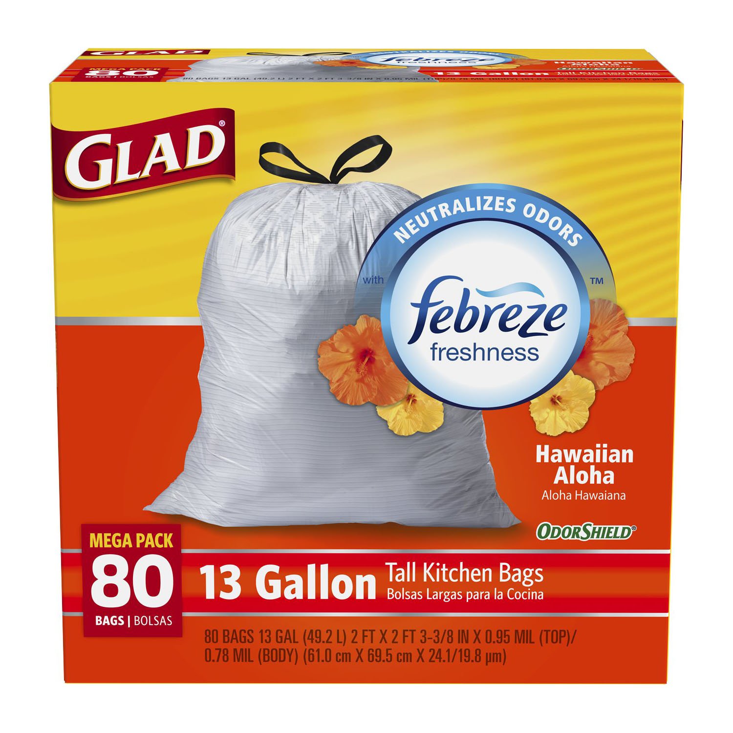 Handle daily kitchen and household demands with glad's13 gallon tall garbage bag in a febreze fresh clean scent 5 day odor control: